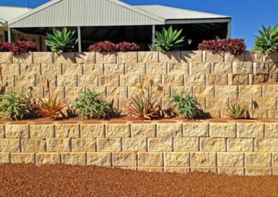 The design of the block gives flexibility to create corners, curves and a creative design. Each block provides the option of round smooth face, or flat rock face surface. The block is aesthetically pleasing and versatile. The hollow block can be attractively planted to produce an enhanced, softer, “living wall”.